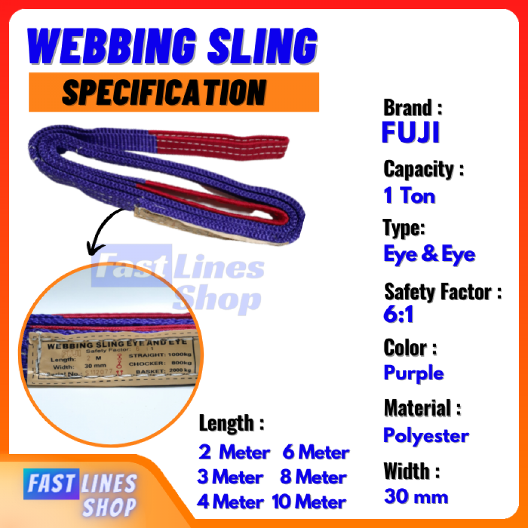Webbing sling adalah alat bantu angkat berupa anyaman/tenunan (webbing) yang biasanya terbuat dari polyester atau bahan lainya dan dibuat berbentuk datar atau pipih menyerupai tali / sabuk. Webbing sling yang umum kita jumpai di pasaran menggunakan material polyester.Polyester ini dipilih dengan pertimbangan lebih ringan sehingga mudah dan aman digunakan untuk lifting atau mengangkat, lebih fleksibel, tidak berkarat sehingga tidak merusak besi, tidak merusak atau membuat kotor barang yang diangkat dan mudah untuk diinspeksi, serta harganya relatif terjangkau.Spesifikasi Tali Webbing Sling Belt :Merk : FujiKapasitas : 1 TonType : Eye and EyeSafety Factor : 6:1Warna : Purple